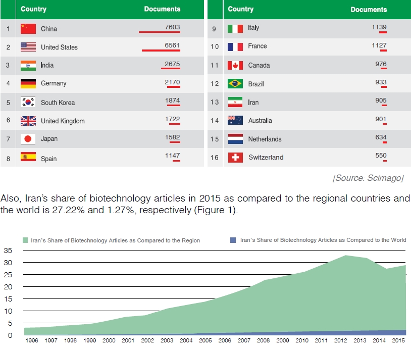 Επίσης, το μερίδιο του Ιράν στα βιοτεχνολογικά άρθρα το 2015 σε σύγκριση με τις περιφερειακές χώρες και τον κόσμο είναι 27,22% και 1,27% αντίστοιχα (Σχήμα 1).